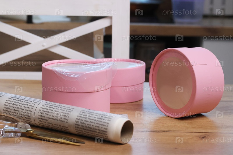 Три небольшие подарочные коробки с окошками. Они лежат на столе. Рядом с ними рулон крафт-бумаги. Маленькая розовая коробка. Подарочная упаковка