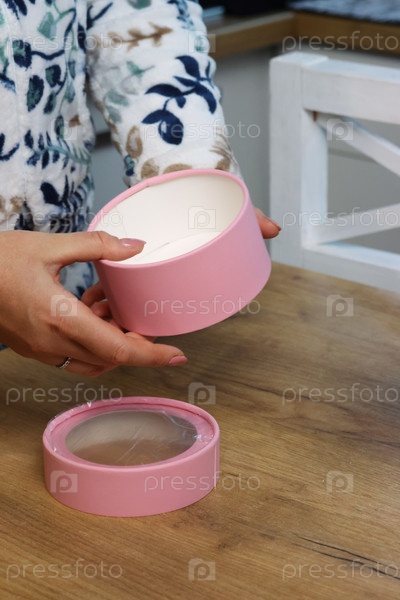 Женщина рассматривает подарочную коробку с окном. Маленькая розовая коробка. Подарочная упаковка