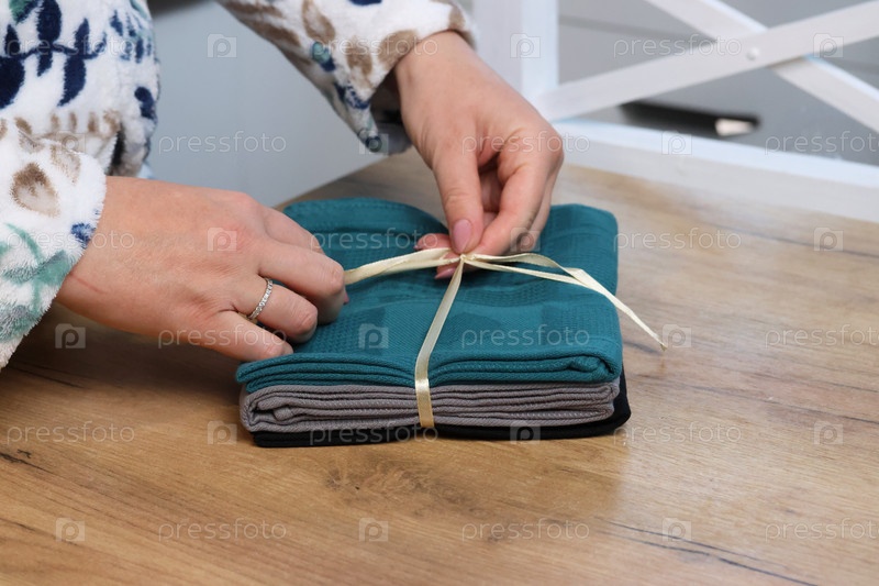 Женщина распаковывает и рассматривает набор кухонных полотенец. Три полотенца разных цветов лежат на столе, перевязанные веревкой