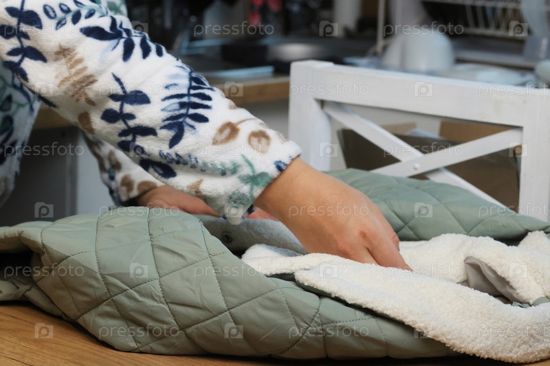 Женщина рассматривает куртку. Стеганая длинная куртка. Воротник крупным планом
