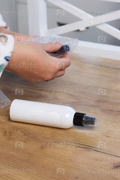Женщина рассматривает покупку. Пластиковые бутылки с дозатором - распылитель