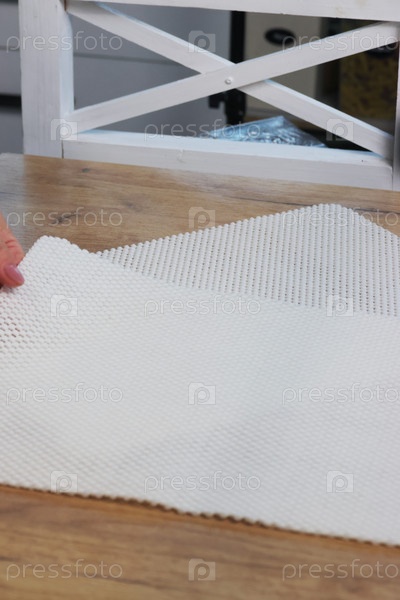 Эластичные коврики для посуды. Лежат на столе. Женщина рассматривает покупку