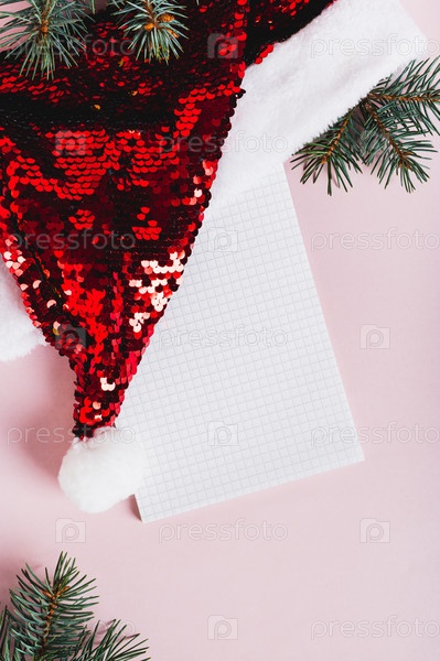 Пустой блокнот, шапка Санта-Клауса и еловые ветки на розовом фоне вертикальный вид