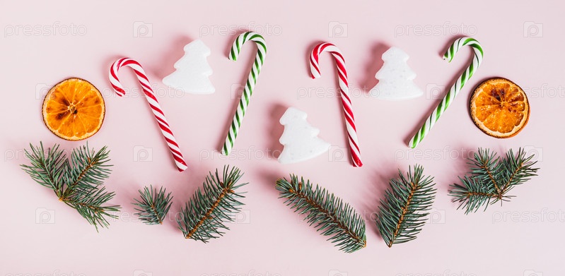 Рождественская композиция из еловых веток, апельсина, игрушек и леденцов на розовом веб-баннере сверху