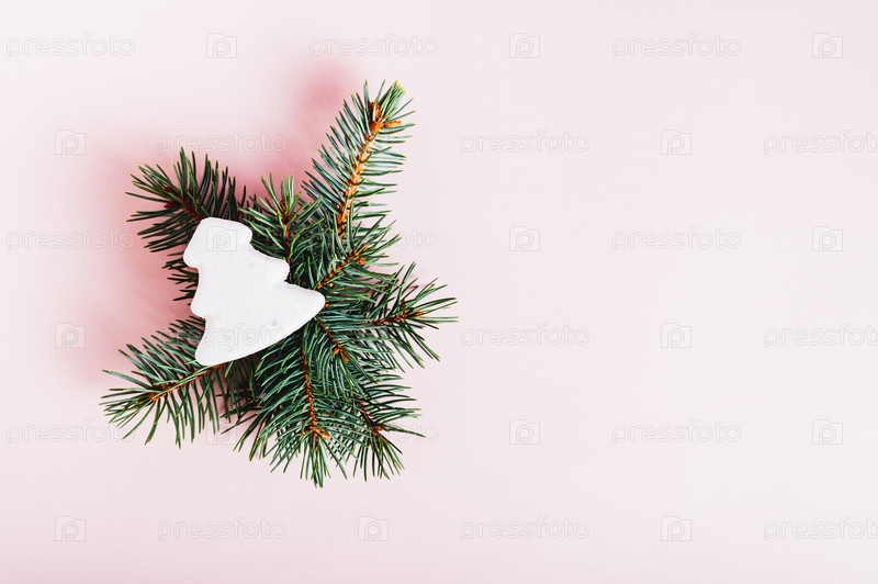 Игрушечная белая ель в букете из живых еловых веток на розовом фоне вид сверху