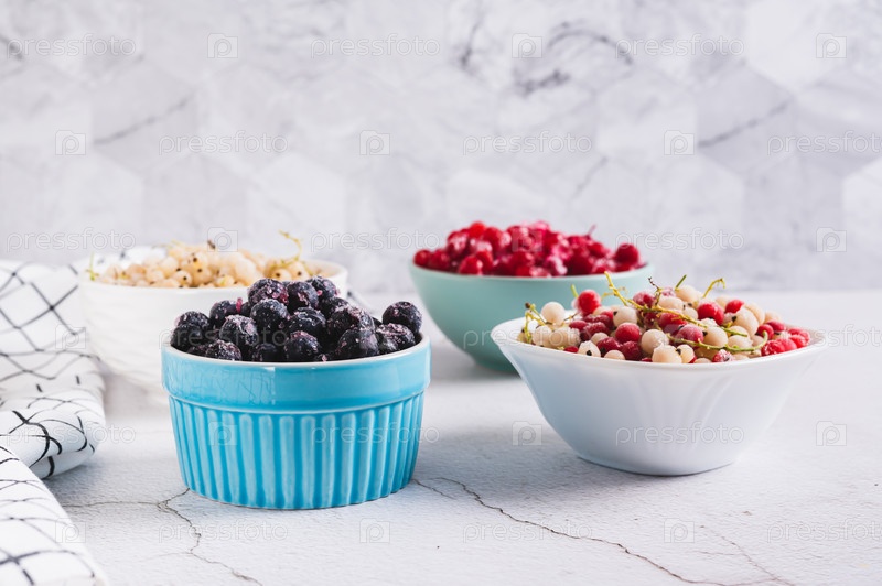 Ассорти из замороженных красных, белых и черных ягод в мисках на столе