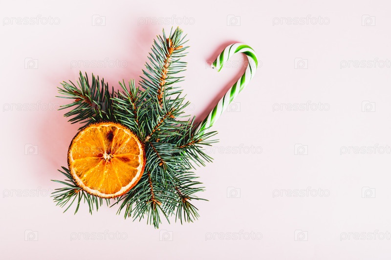 Сушеный апельсин и леденец в букете из живых еловых веток на розовом фоне, вид сверху