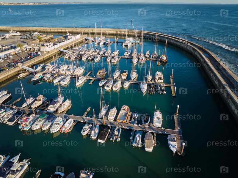Вид с воздуха на пристань Кашкайша с пришвартованными яхтами и городским пейзажем Кашкайша, Португалия, на закате