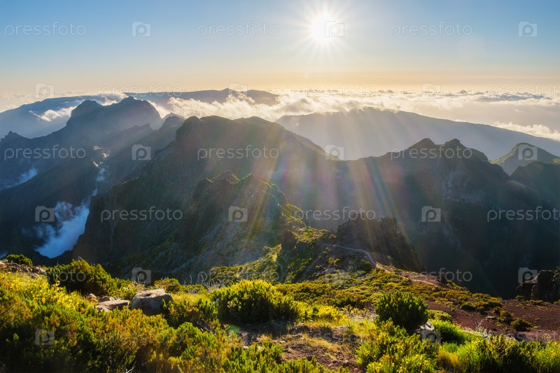 Вид на горы над облаками с Пико Руиво на закате. Остров Мадейра, Португалия
