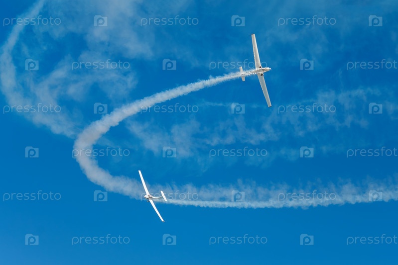 Самолет-пилотажник, выполняющий трюки в голубом небе с дымовым следом. Концепция командной работы, сотрудничества, координации, доверия, точности, сложности, вызова, скорости, синергии
