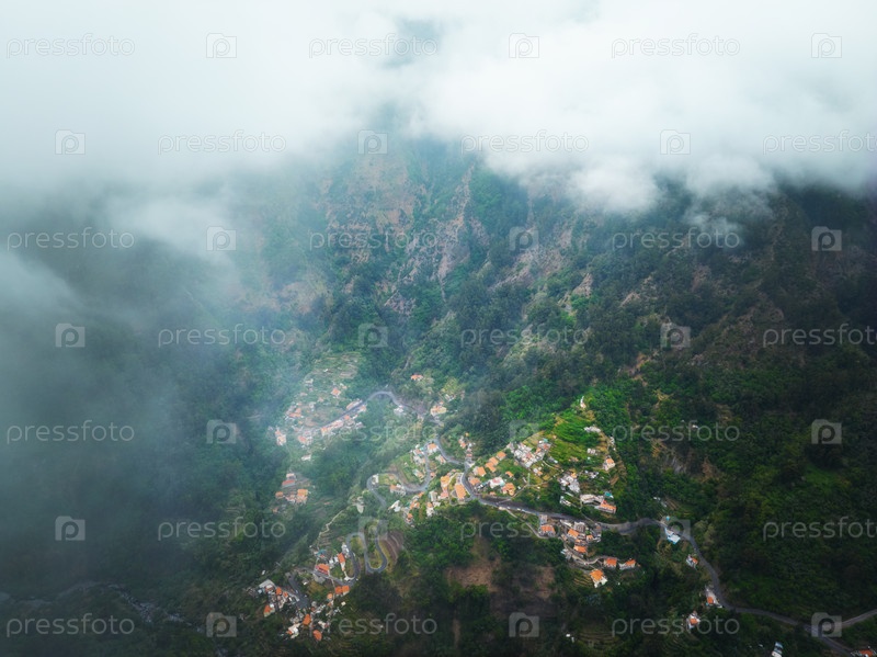 Вид с дрона на деревню Куррал-дас-Фрейрас в Долине монахинь из Мирадуро-да-Эйра-ду-Серрадо, остров Мадейра, Португалия