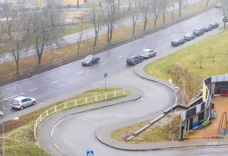 Площадной снимок въезда в жилой район. Городской