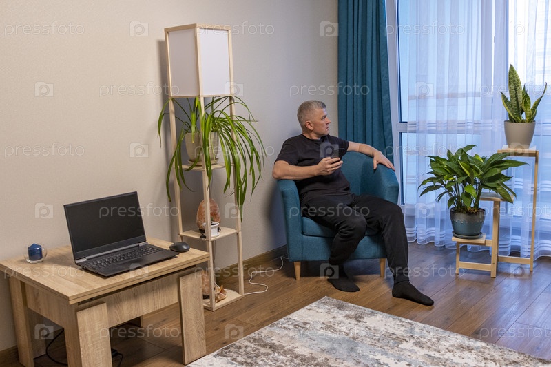 Мужчина с телефоном сидит в уютном углу квартиры на удобном кресле. Люди