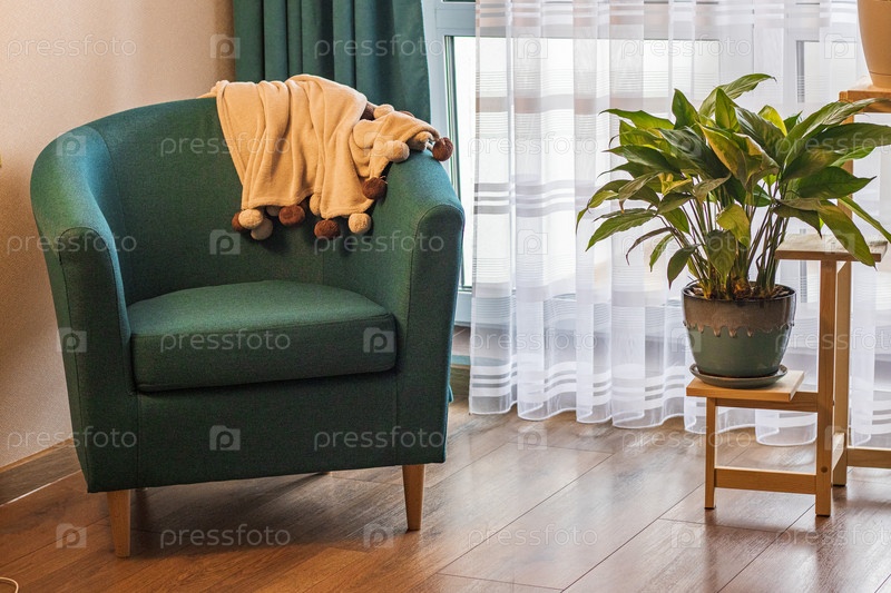 Крупный план уютного уголка в квартире с удобным креслом. Интерьер