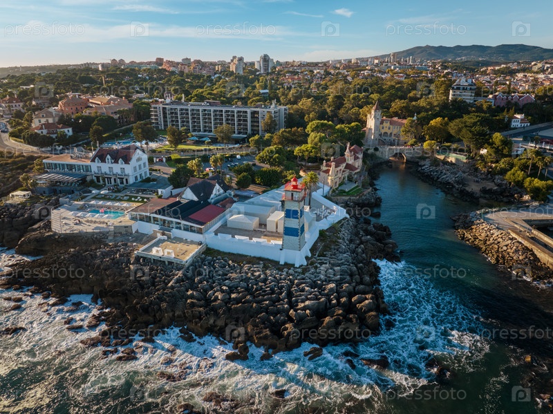 Вид с воздуха на маяк Санта-Марта и пристань Кашкайша с пришвартованными яхтами на фоне городского пейзажа Кашкайша, Португалия на закате