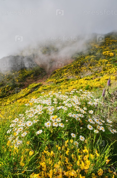 Пейзаж Мадейры с ромашками и цветущими кустарниками Cytisus и горами в облаках Мирадурос-ду-Паредау, остров Мадейра, Португалия