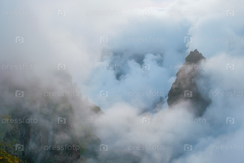 Гора, покрытая туманом и облаками, с цветущими кустами Cytisus. рядом с Пику-де-Арейру, остров Мадейра, Португалия