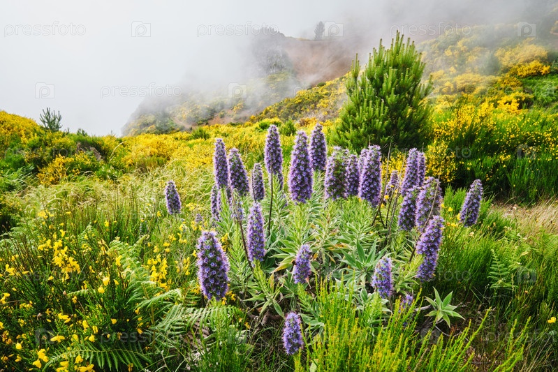 Ландшафт Мадейры с цветами Pride of Madeira и цветущими кустарниками Cytisus, Португалия