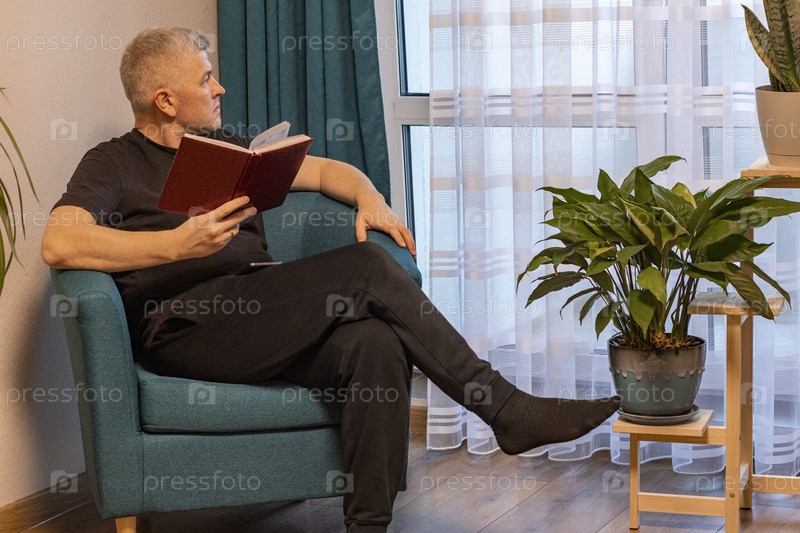 Мужчина с книгой сидит, читает в уютном уголке в квартире на удобном кресле. Люди