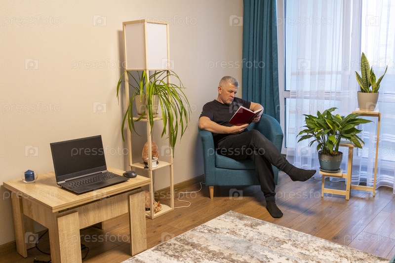Мужчина с телефоном сидит в уютном углу квартиры на удобном кресле. Люди