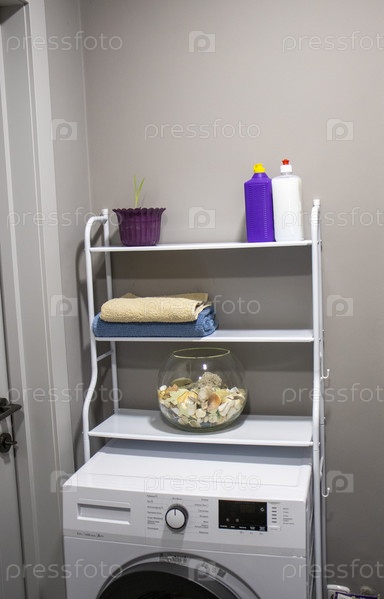 Полка над стиральной машиной с предметами домашнего обихода. В помещении