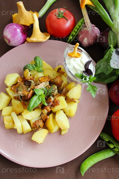 Жареный картофель с лисичками и сметаной на розовой тарелке