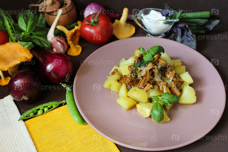 Жареный картофель с лисичками, зеленью и сметаной на столе
