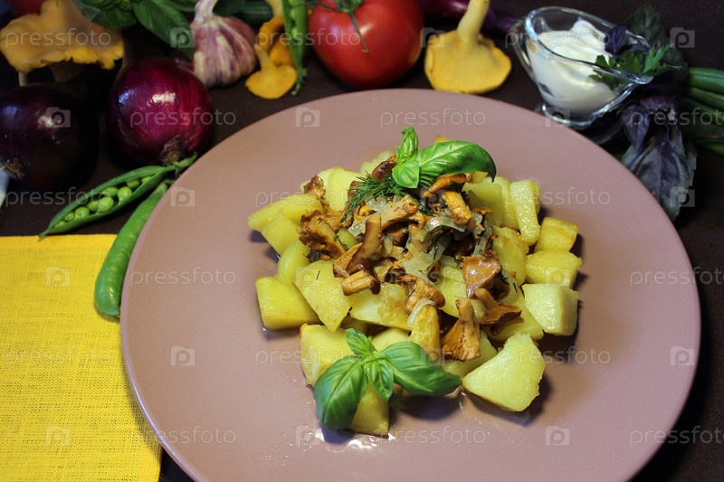 Жареный картофель с лисичками и зеленью на розовой тарелке