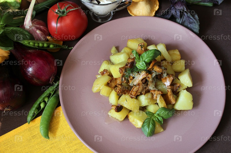Жареный картофель с лисичками и свежей зеленью на розовой тарелке