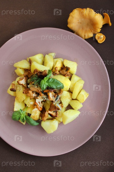 Жареный картофель с лисичками и базиликом на розовой тарелке