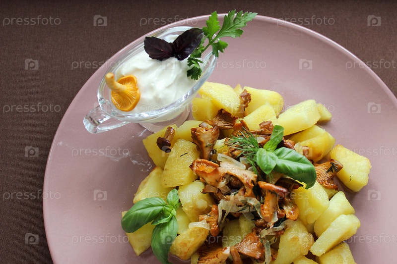 Жареный картофель с лисичками и сметаной на розовой тарелке