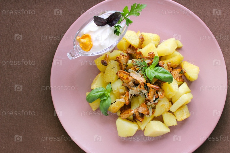 Жареный картофель с лисичками и сметанным соусом, украшенный свежей зеленью