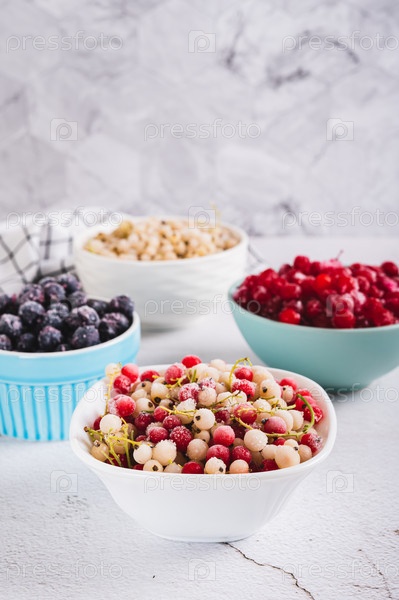 Ассорти из замороженных красных, белых и черных ягод в мисках на столе, вертикальный вид