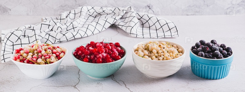 Ассорти из замороженных красных, белых и черных ягод в мисках на столе веб-баннер