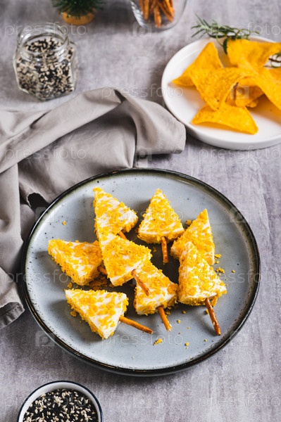 Рождественские елки из сыра и начос на тарелке на столе вертикальный вид