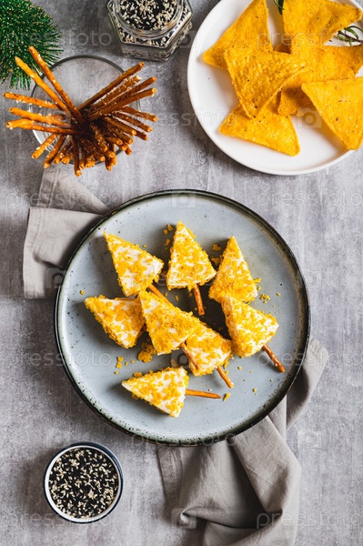Рождественские елки из сыра и начос на тарелке на столешнице и вертикальный вид