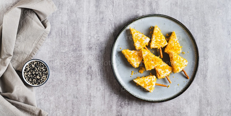 Рождественские елки из сыра и начос на тарелке на столешнице веб-баннер