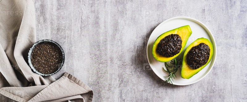 Вегетарианское авокадо с черной икрой чиа на тарелке на столешнице веб-баннер