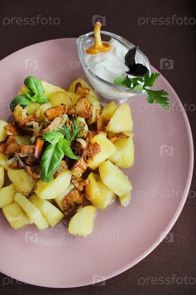 Жареный картофель с лисичками и сметанным соусом, украшенный зеленью