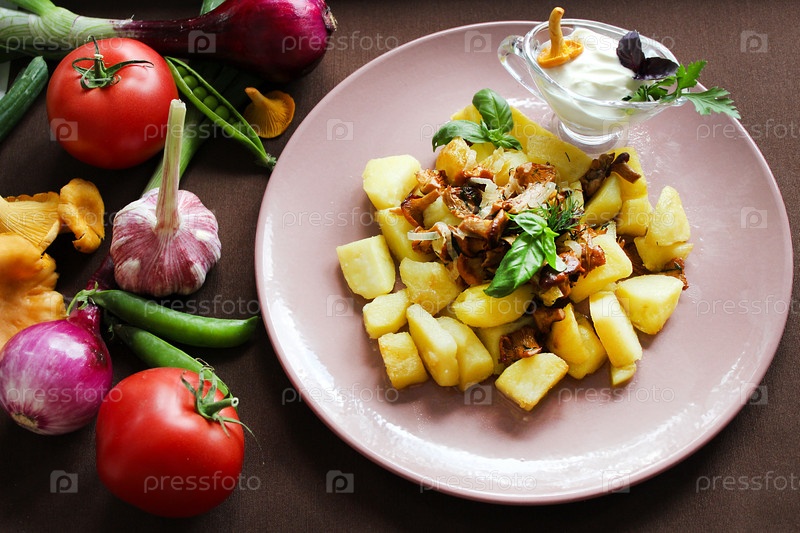 Жареный картофель с лисичками и сметаной на розовой тарелке с овощами
