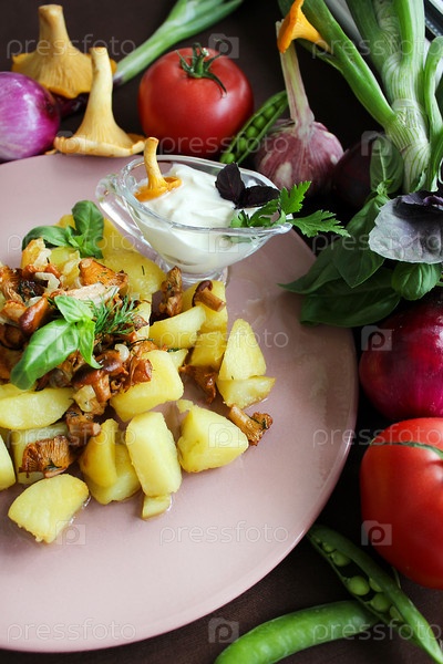 Жареный картофель с лисичками и сметанным соусом в окружении свежих овощей