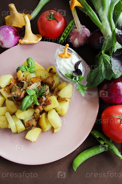 Жареный картофель с лисичками и сметаной на розовой тарелке с овощами