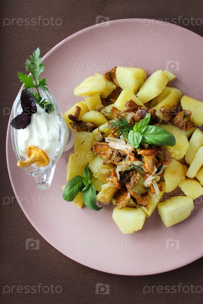 Жареный картофель с лисичками и сметаной на розовой тарелке