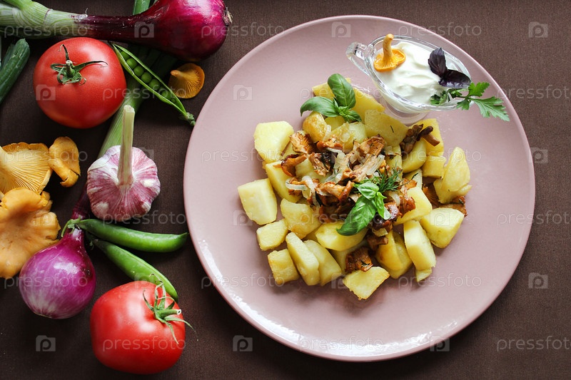 Жареный картофель с лисичками и сметаной на розовой тарелке с овощами
