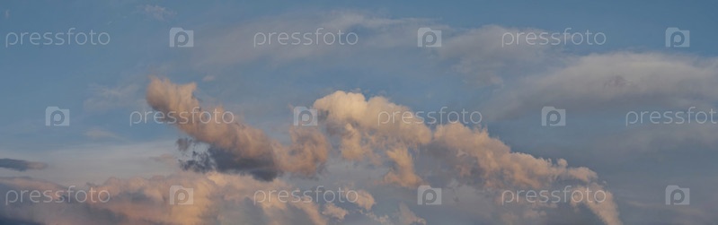 Россия. Юг Западной Сибири. Панорама вечернего летнего неба с разноцветными облаками над полями Кузнецкого Алатау
