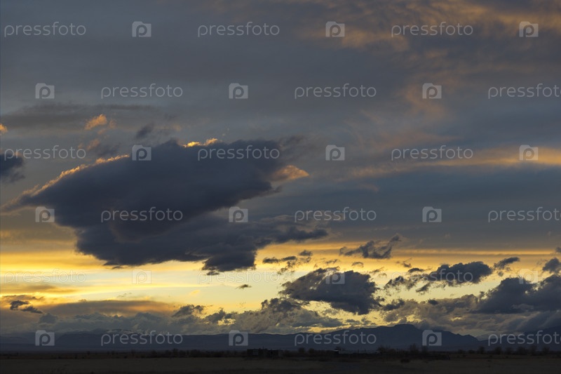Россия. Юг Западной Сибири. Панорама вечернего летнего неба с разноцветными облаками над полями Кузнецкого Алатау