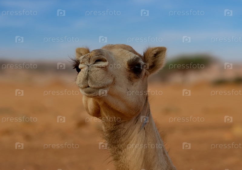 Западная Африка. Мавритания. Портрет одногорбого верблюда в горячих песка высоких дюн в бескрайней пустыне Сахара