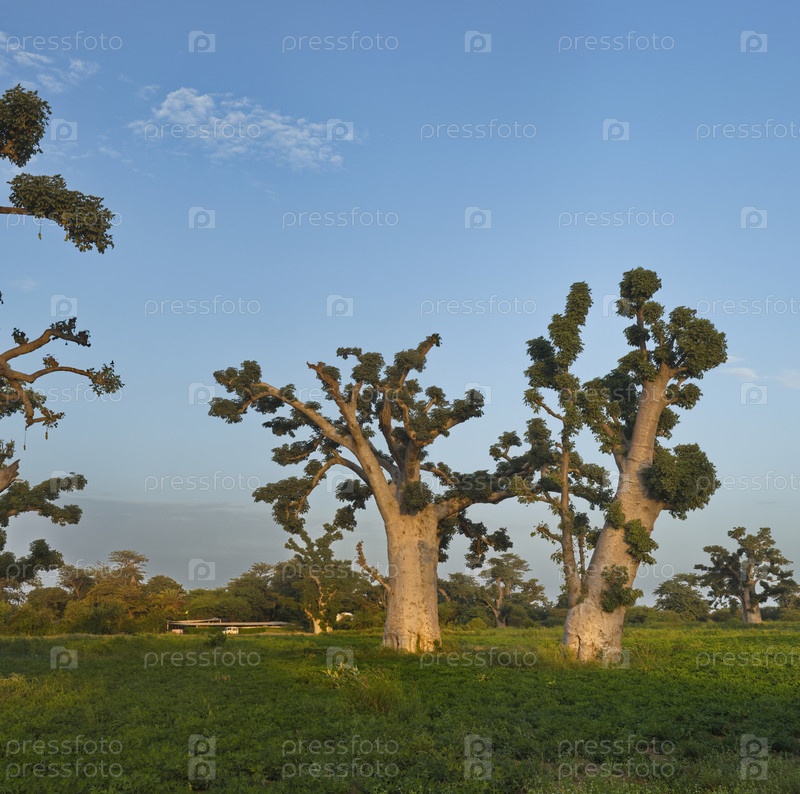 Западная Африка. Сенегал. Живописная панорама с одинокими огромными баобабами на арахисовом поле в лучах заходящего солнца