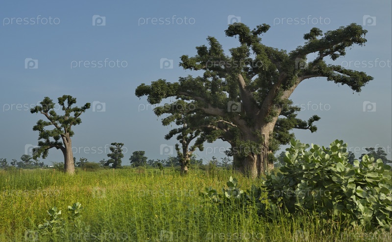 Западная Африка. Сенегал. Живописная панорама с одинокими огромными баобабами на арахисовом поле в лучах заходящего солнца