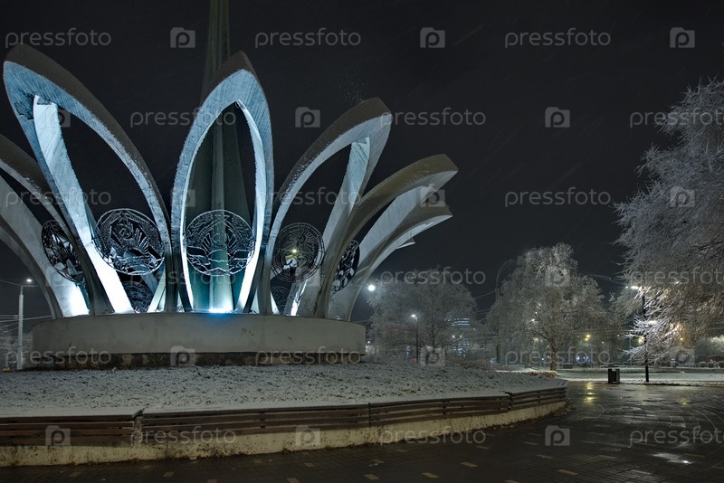 Новокузнецк, Россия. 01 ноября 2024 года. Ночной вид мемориала в честь 50-летия СССР с лепестками 15-и союзных республик, покрытый первым осенним снегом и подсвеченная фонарями холодного света